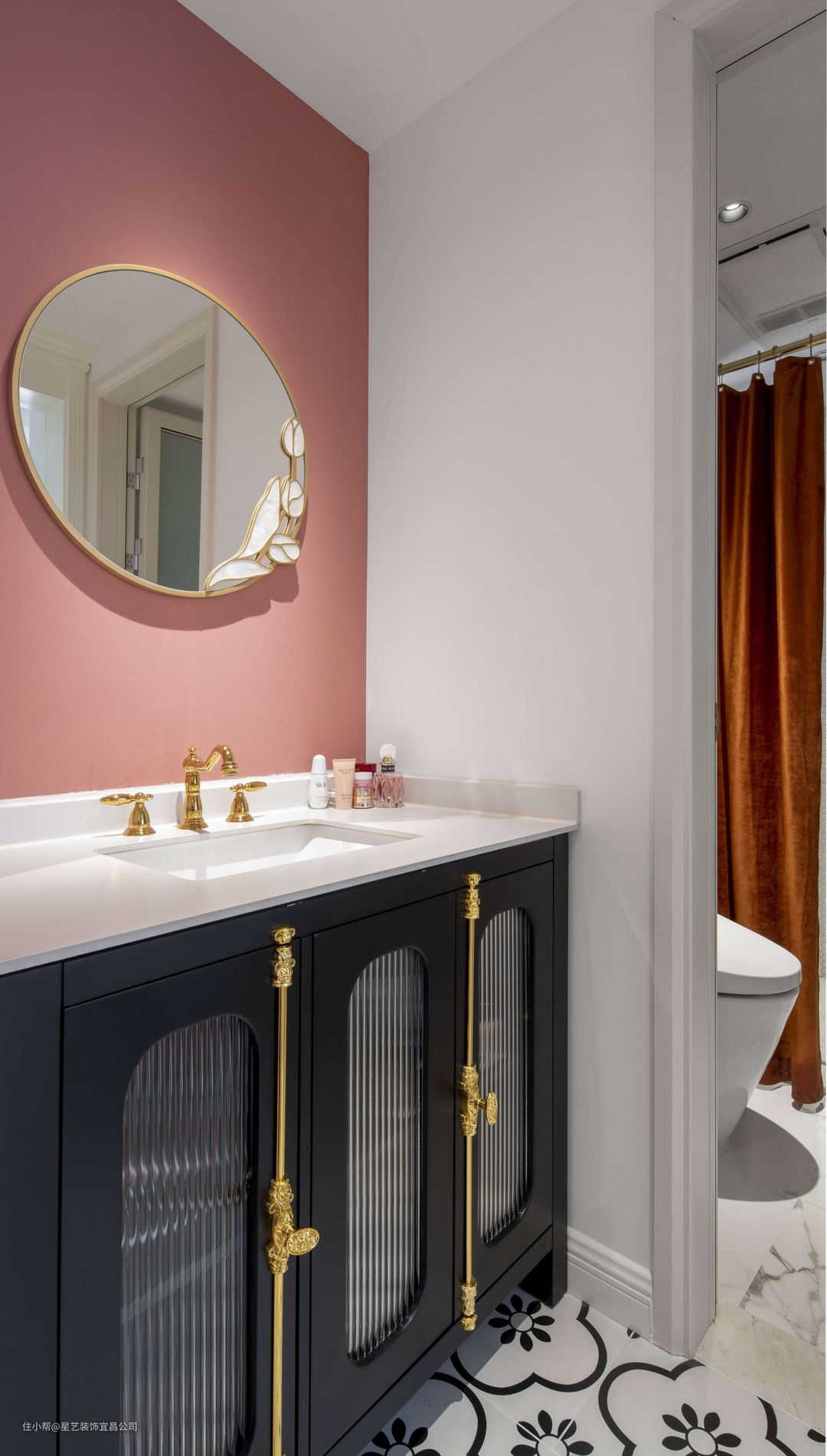 🧡卫生间台面粉白配色,浪漫干净又充满了治愈感,黑色的柜门又赋予整个卫生间复古的感觉。金色把手、水龙头和金色边框的点缀增加了空间的精致感,却又不会喧宾夺主。