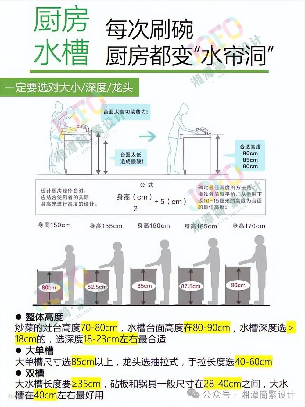 请注意,地柜的高度设计应根据家中最常下厨的人的身高而定,可以参考以下公式:身高÷2+5cm。