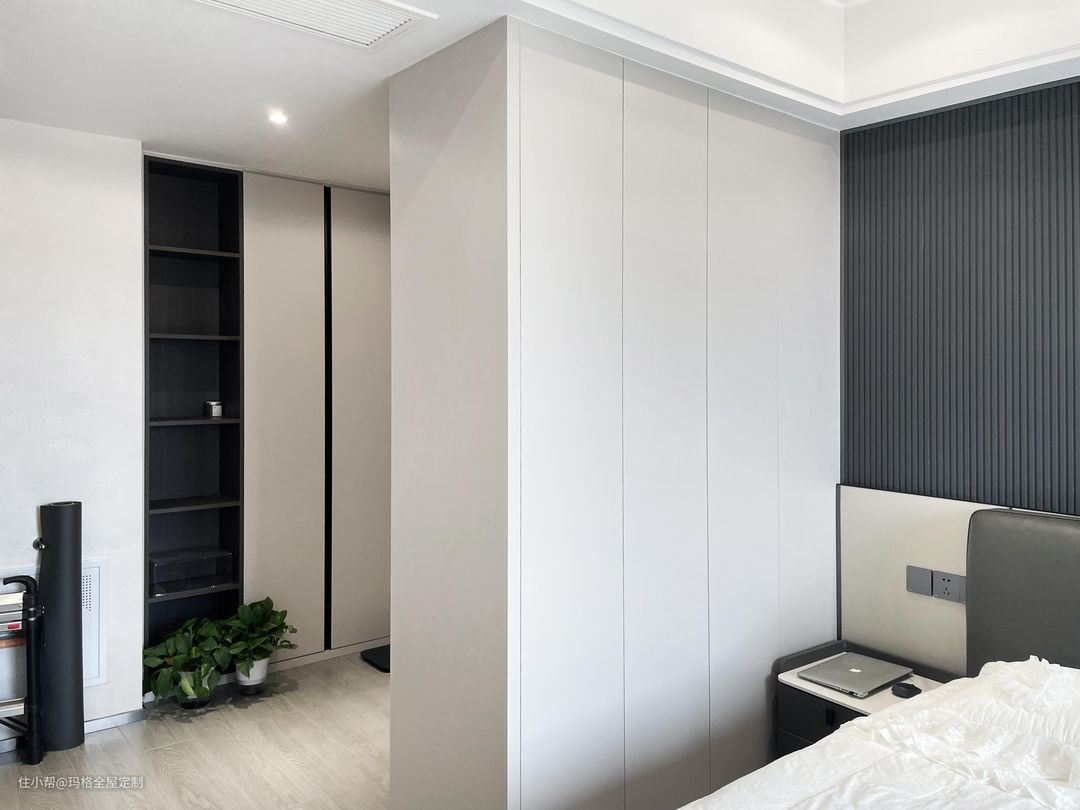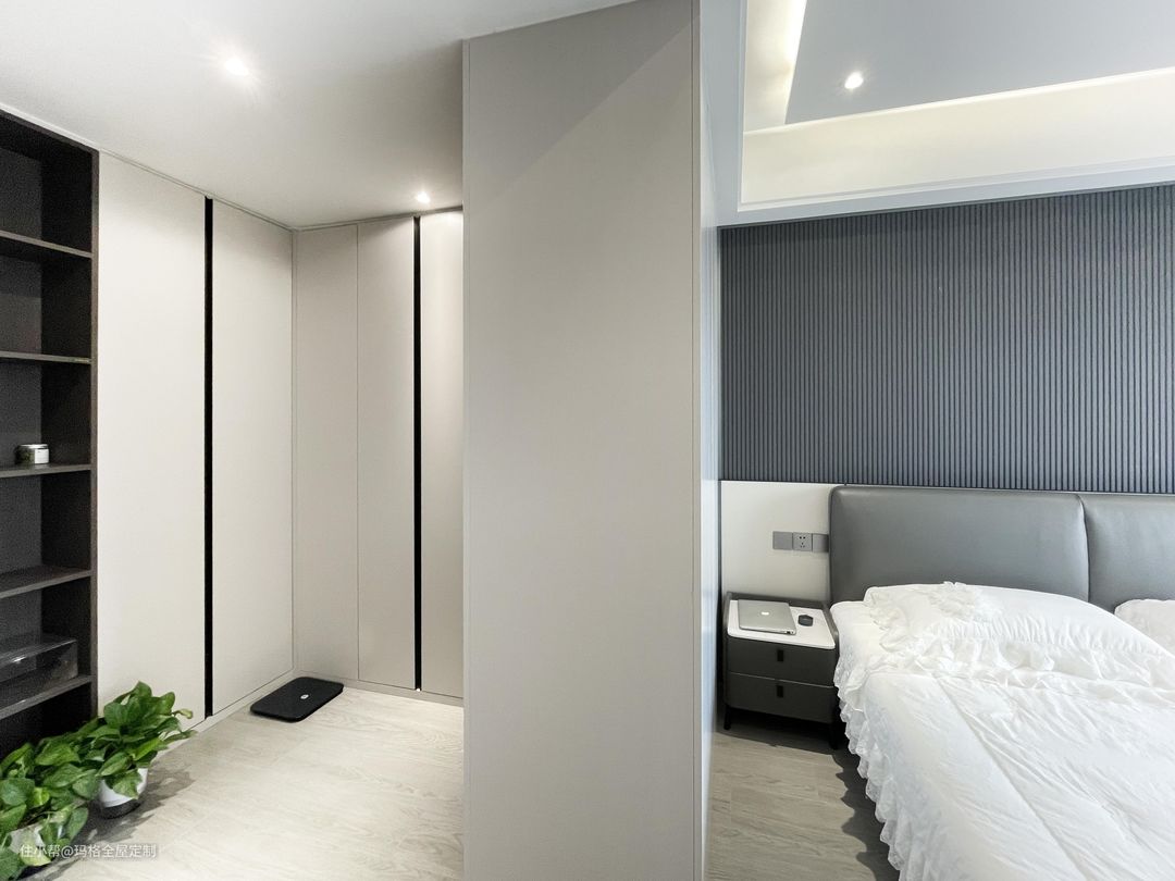 顾名思义就是衣柜门板从地面一路到天花板,这种大气的设计在近几年非常流行,也是许多人的选择。但切记要用内嵌拉手的一体门板,或者不要拉手,直接在里面加装反弹器。不然拉手的存在会大大影响颜值。