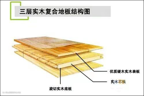 三层实木复合地板由锯切或旋切的优质硬木做表层,松木、桦木等速生软木做中间层,旋切单板软木做底层。