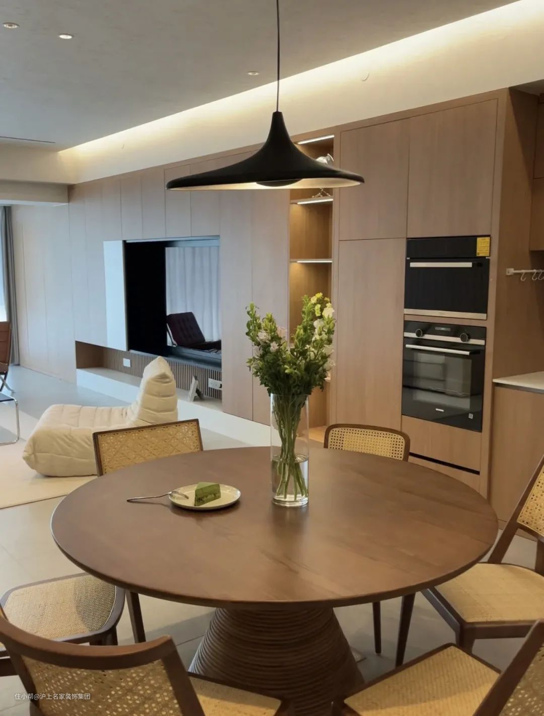 吊灯不仅能将照亮食物和空间,在增加氛围感和用餐仪式感上也是一把好手,甚至还能拉伸纵向层次,“拔高”整个客餐厅。