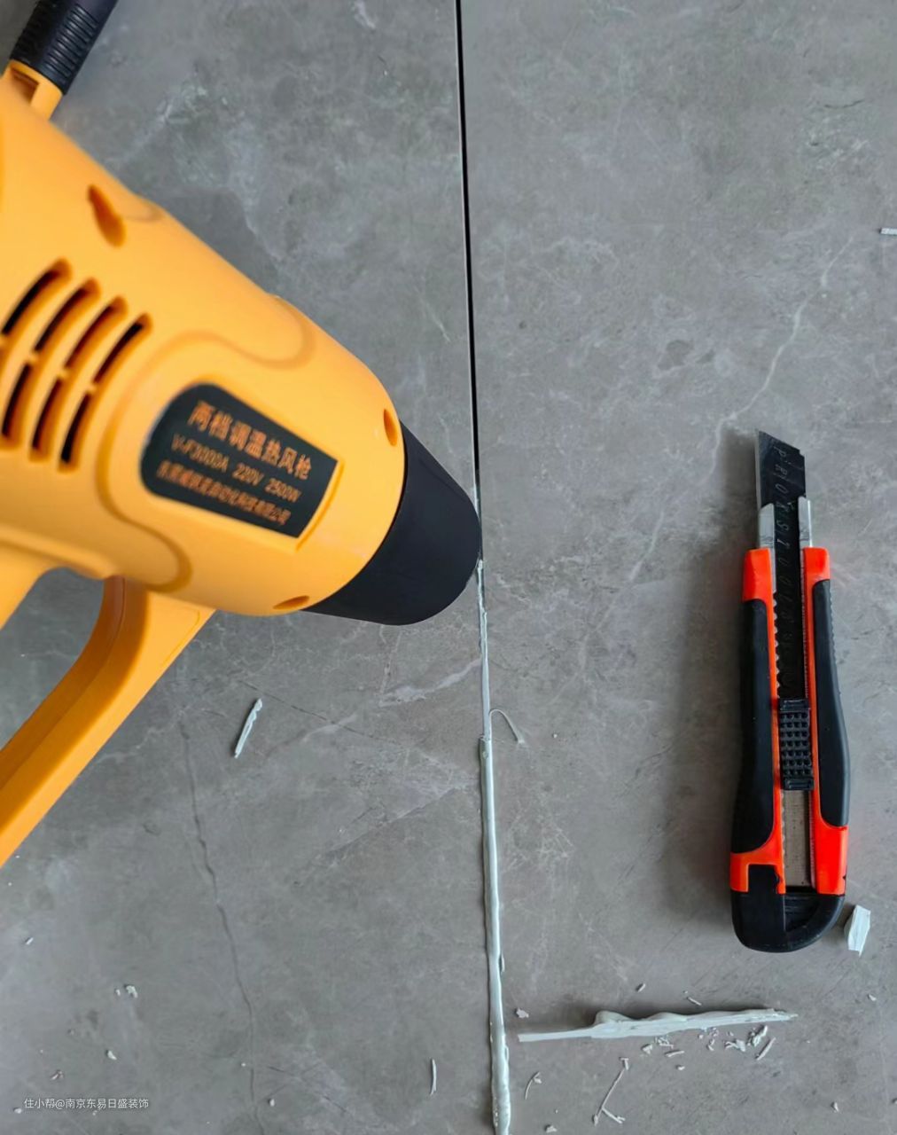 如果上述方法都不能清除美缝残留,可考虑热风枪。有时美缝剂在仿古砖、木纹砖等不光滑的瓷砖上,用铲刀并不能完全清除干净,可用热风枪将美缝剂软化,再用铲刀与抹布擦拭。