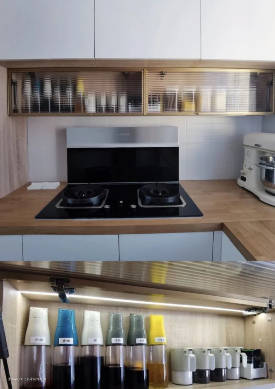 不想额外增加工具,也可以在定制橱柜时将吊柜分成两部分,上方做平开门用于大件储物囤货;下方做上翻盖玻璃柜门,放置常用的调味品罐子和水杯等,也很顺手。