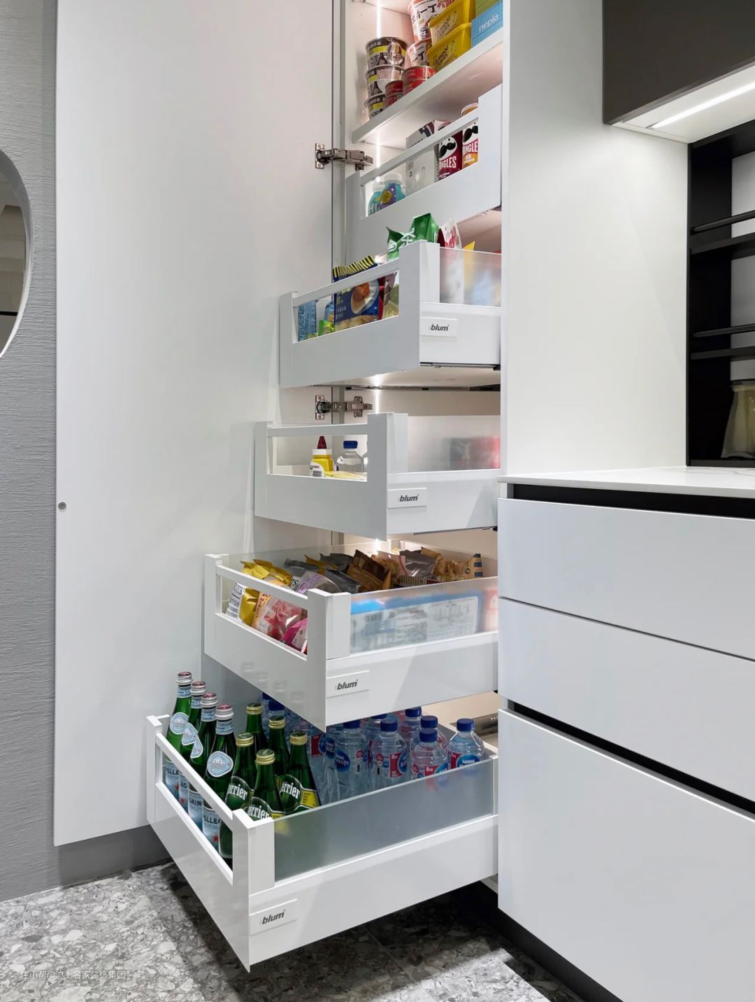 不如跟装友@赵布布 学学,放弃柜门收纳,把整体五金换成U型抽屉。这样设计有两个妙处: