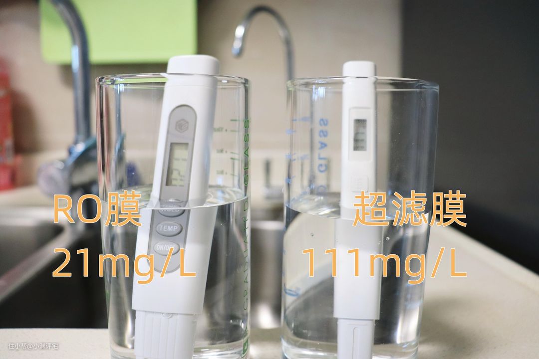 上图是超滤膜过滤水和RO膜过滤水的离子浓度对比,可以看到:超滤膜过滤后的水离子浓度在100mg/L以上,压根不符合直饮水标准(50mg/L)更不符合纯净水的标准(30mg/L)。