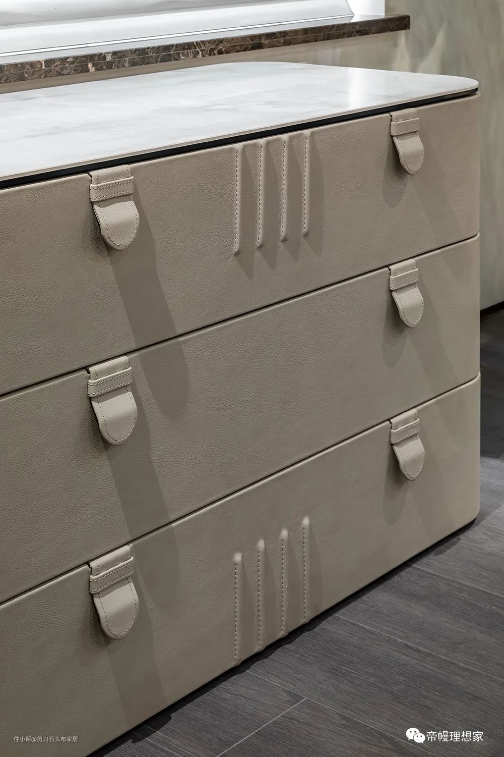 白色陶瓷台面搭配米色皮革柜体,饰以皮扣把手,抽屉内配备绒面衬垫,隽永优雅。