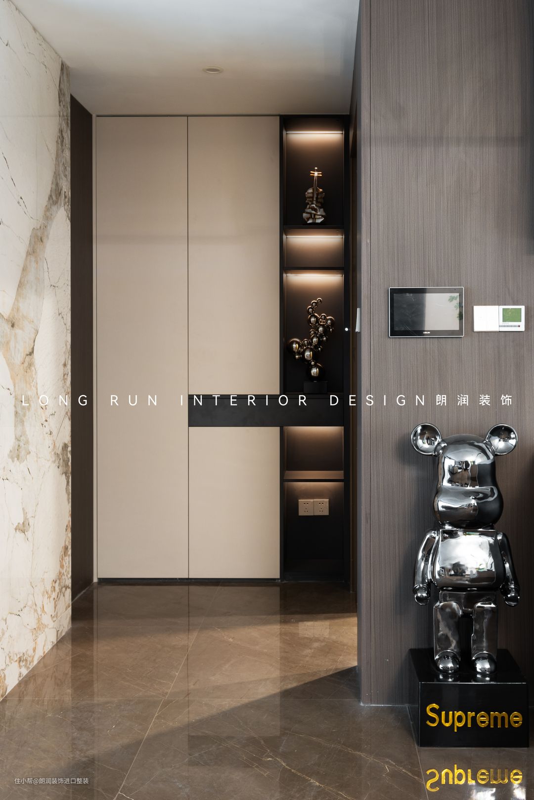 如果门后墙壁位置不够,可以利用门对面的空间打造L型玄关柜,中部留空用于放置包包或者壁画等装饰元素,打造入门的第一道风景线。