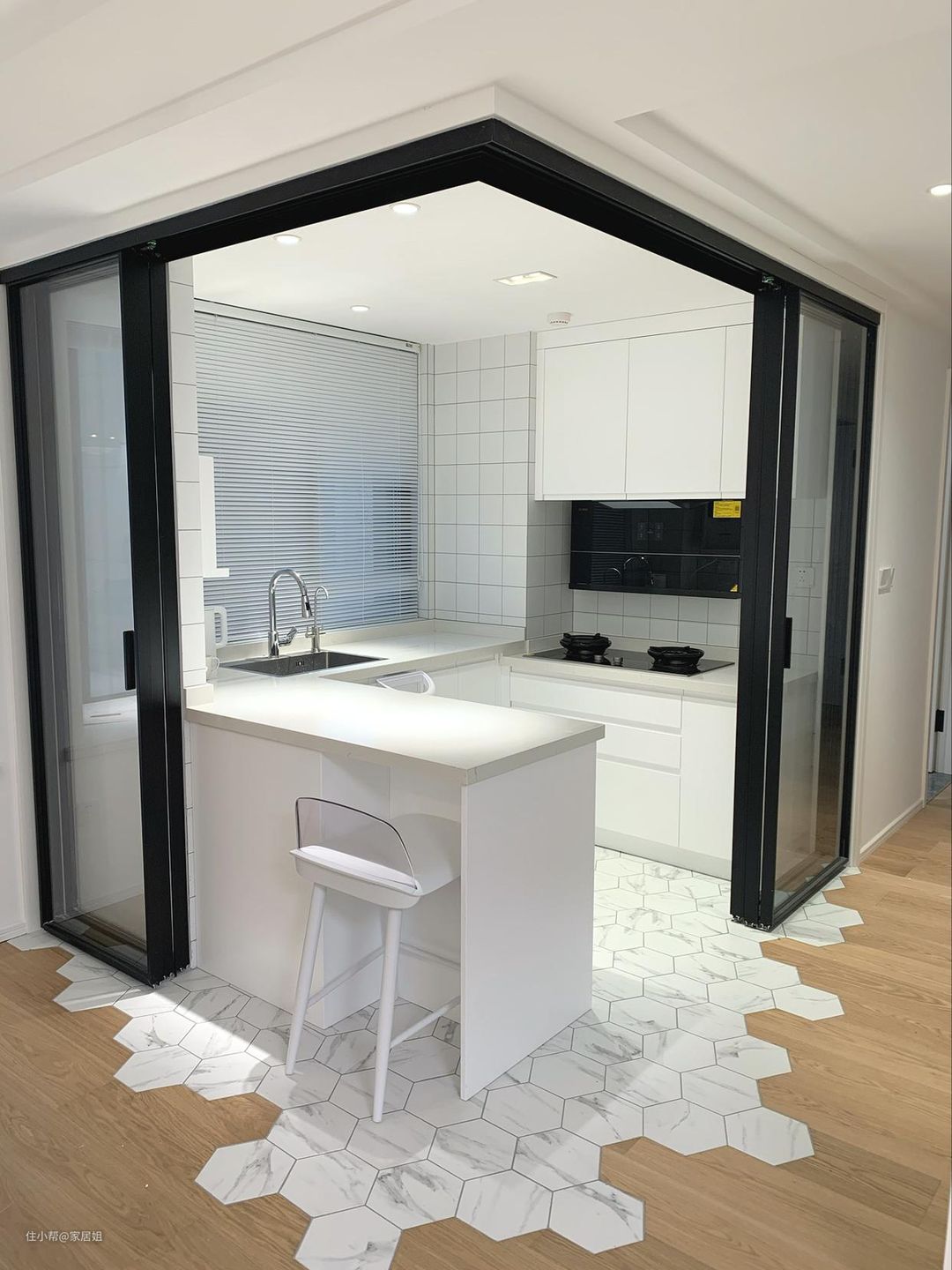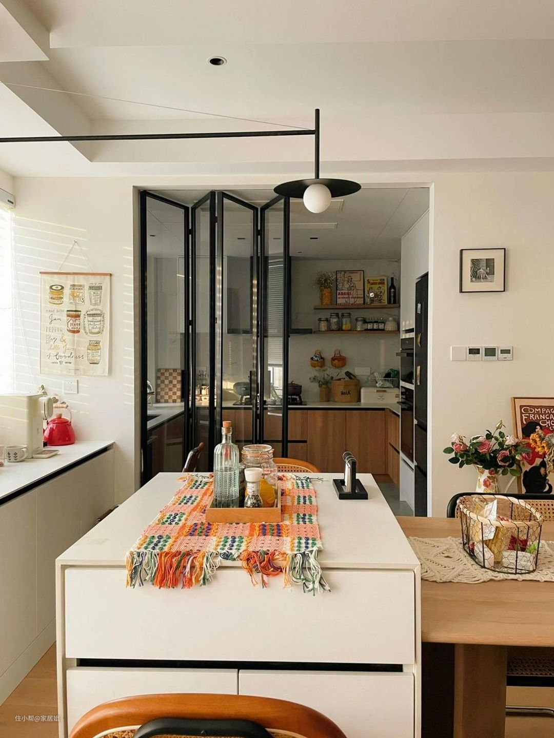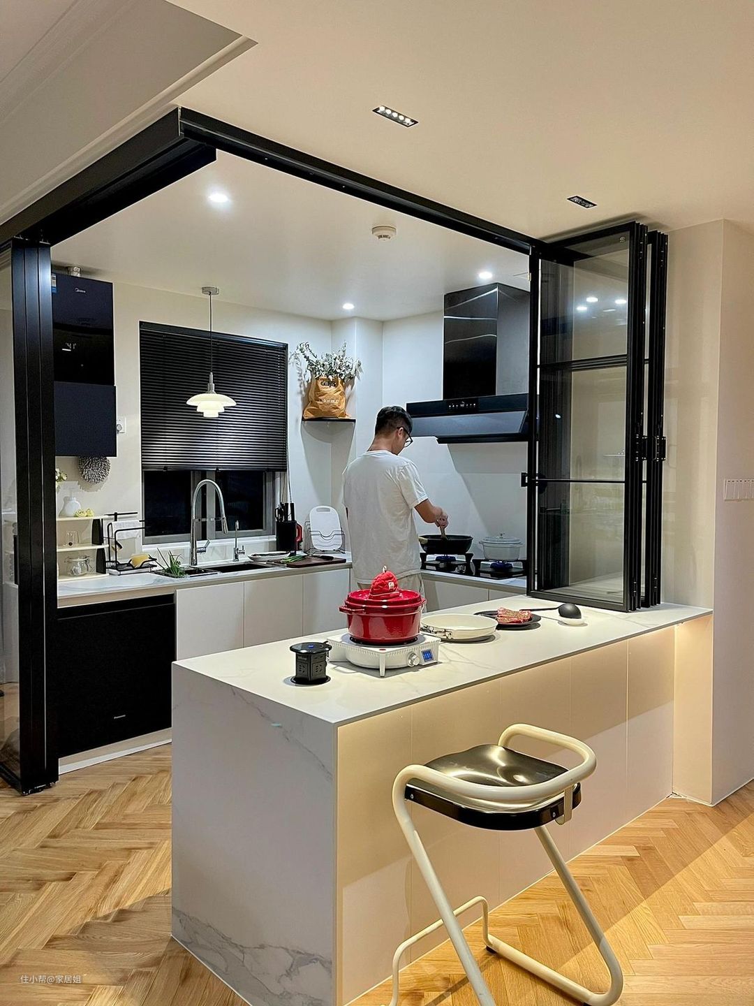 还有网友@熊猫先森家的厨房,他所在的地区不允许全开放式厨房,他又不想过于密闭,于是设计成吧台+3联动推拉门+折叠推拉窗的组合。