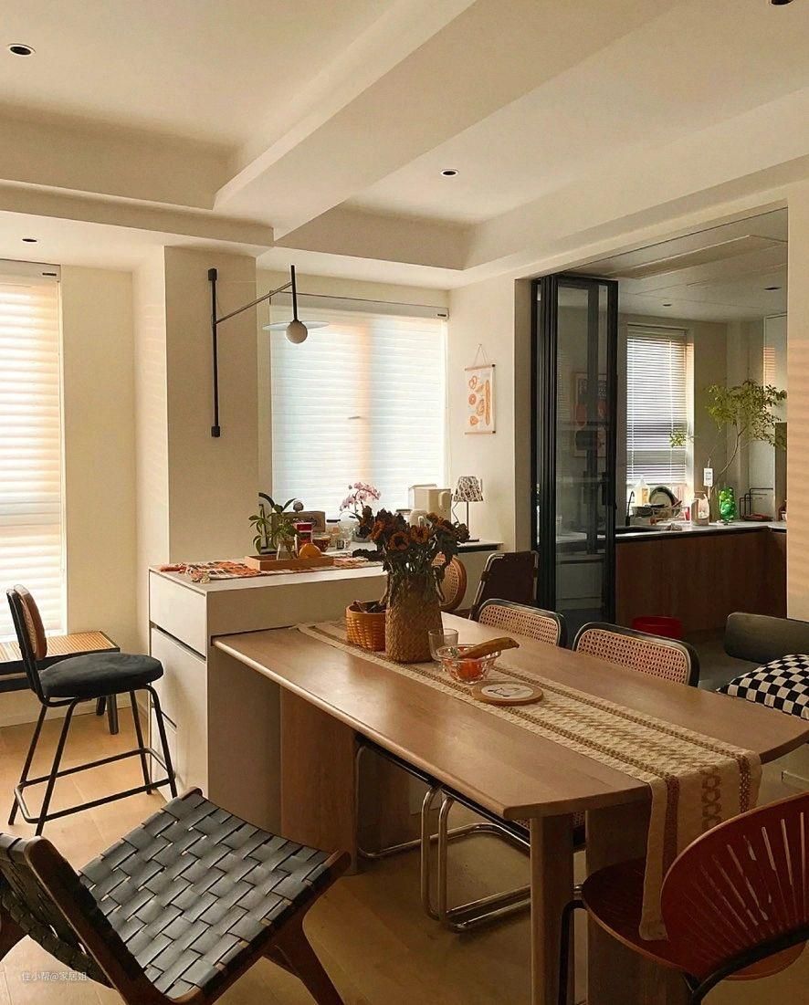 将门折叠起来后,与餐厅一体,就像是开放式厨房一样的效果。