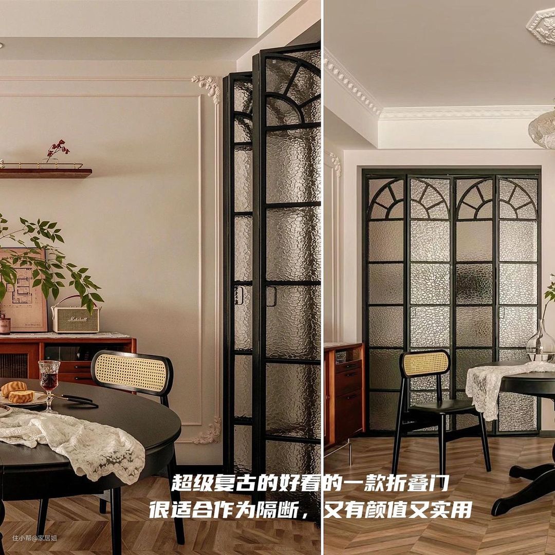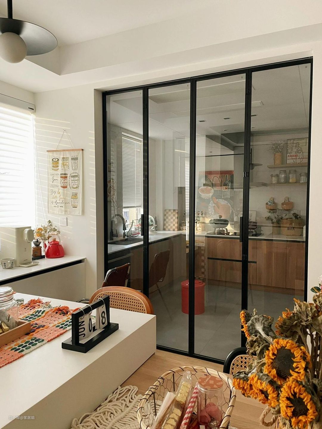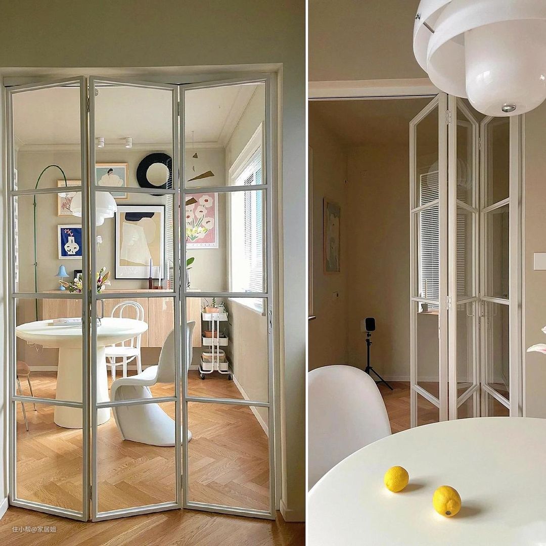 如网友@丸子家的厨房折叠门,是没有做门套的,她说当初是想做开放式厨房,但又担心油烟会跑到餐厅里面,总会有点味道,如果用传统的推拉门的话,整个空间又显得不够通透,于是决定做折叠门。