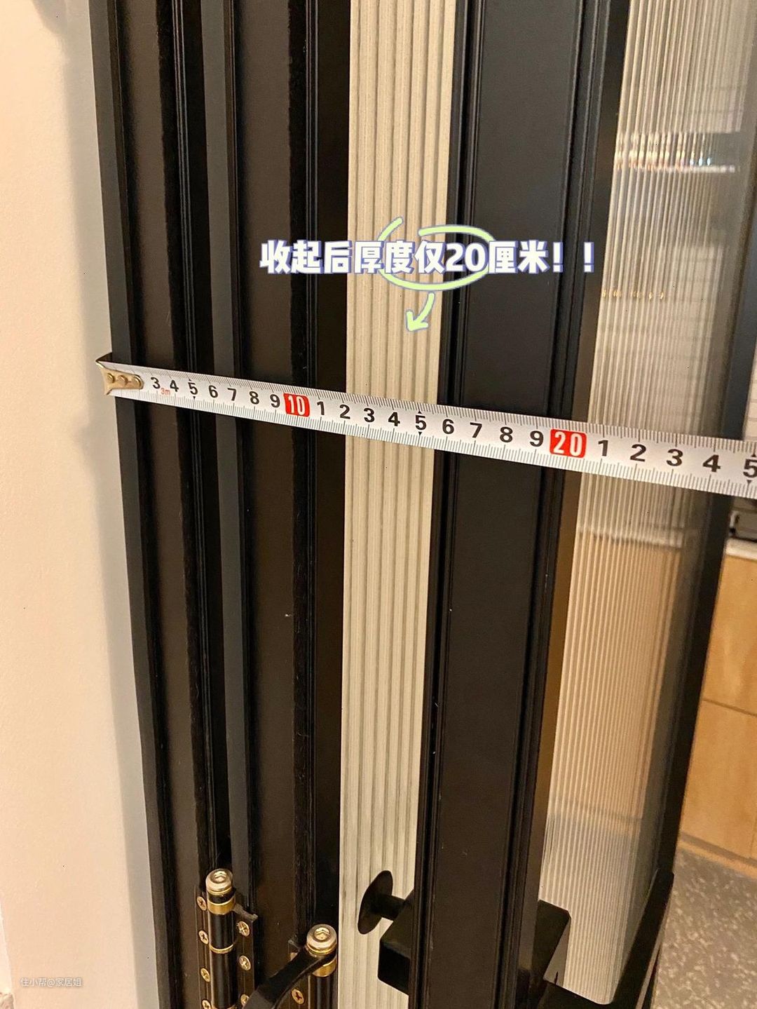 如网友@八零二家的3联长虹玻璃折叠门,收起来后折叠门的厚度20厘米,跟开放式厨房无异。