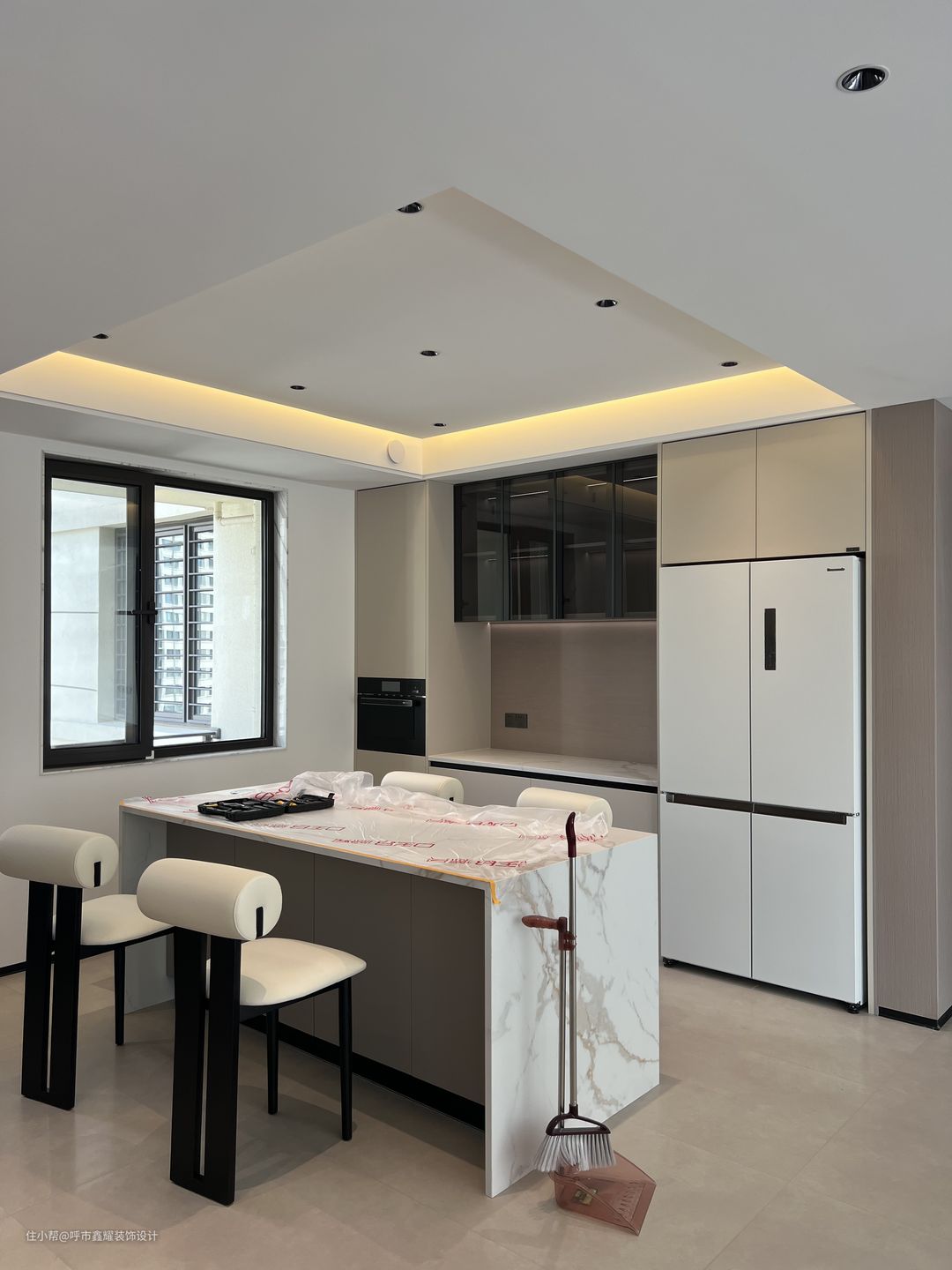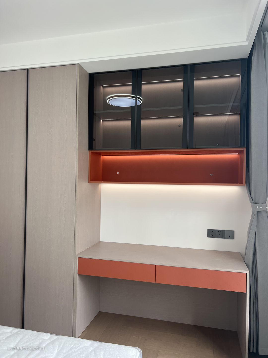 现代轻奢极简风格的设计氛围中融入了更多的设计细节,比如将爱马仕橙色、玻璃柜门点缀其中,增加了空间的质感,让空间更加的饱满有意境, 也充满了各种各样的新鲜感,生活本就是,一半柴米油盐,一半星辰大海。在这个空间里, 设计师想打造的不仅仅是一个美丽的场域,更是在一种对于热爱生活、热爱生命的价值感与归属感。光线的停留暂访,感受到时间的存在与声音的关系,慢慢勾勒出家的空间,带给人柔和而深远的空间感受。