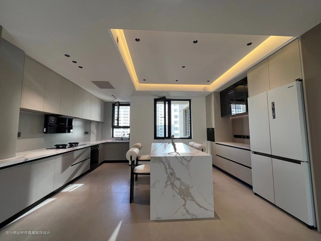 餐厨一体的设计,让空间更合理的应用,整体的色系搭配与客厅保持统一性。不同材质的碰撞呈现一种简练的高级感,餐厨空间紧密相连,理想中的美食有了更多的互动性和可能性,增加情感交流空间更具烟火气息。深灰加白的色调作为厨房的整体配色,方正的岛台实用而且美观,让每天的柴米油盐酱醋茶,散发着不一样的人间烟火味,小心翼翼地抚摸着凡人的心脏。
