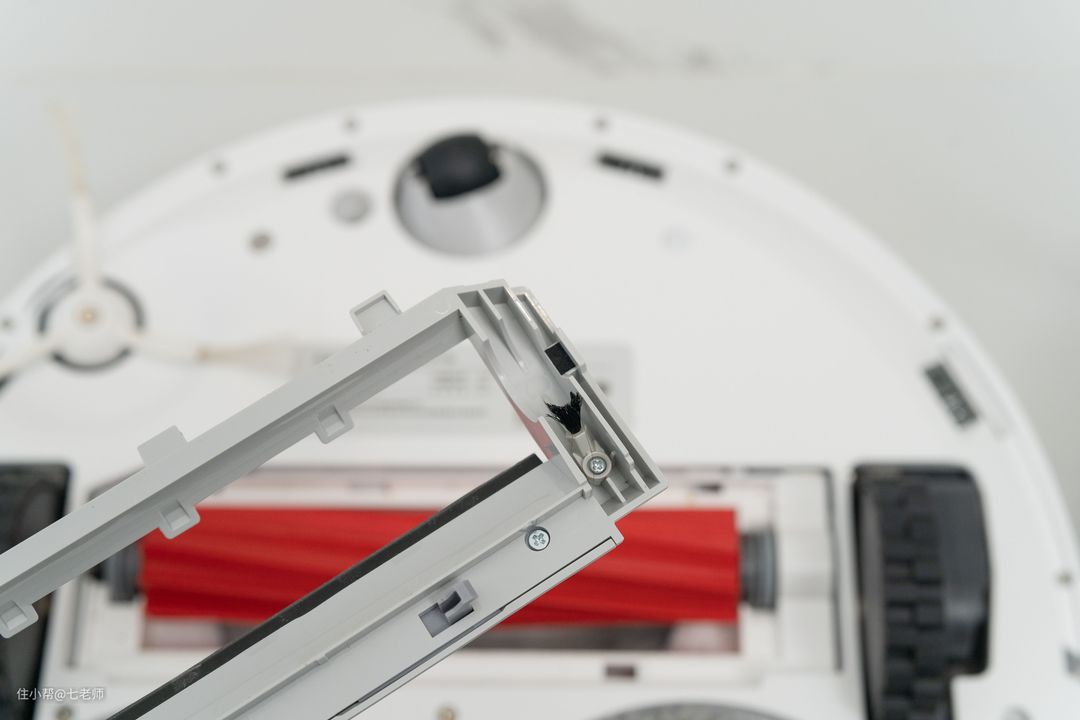 在双螺旋主刷支架固定盖板隐藏有四枚“刀片”,安装好盖板后,刀片会伸出紧贴主刷两端,自动将缠绕在两端的毛发切成碎发,然后吸入尘盒,全新的自维护结构进一步延长了清理主刷的周期。