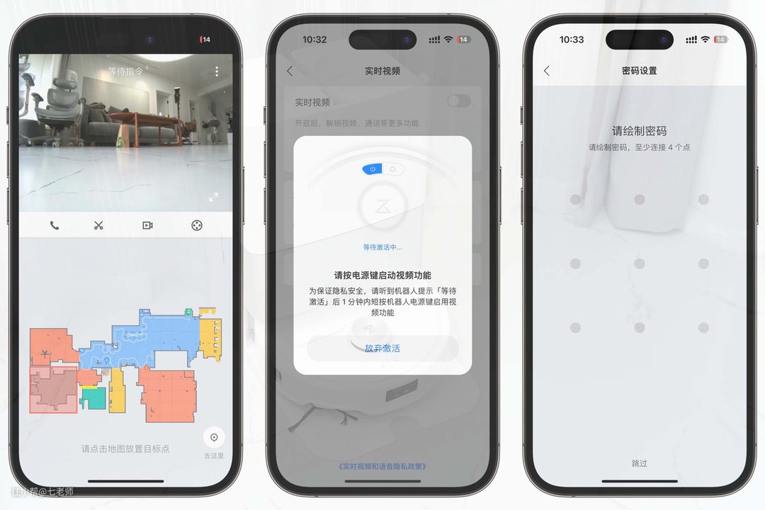 石头P10S Pro支持视频通话功能,首次开启实时视频功能需要按电源键启动,并且每次使用还有一组密码才能开启保证隐私性。日常外出能够通过机器人前方的摄像头视角看看家中的情况,如看看毛孩子是不是在拆家,及时语音制止。