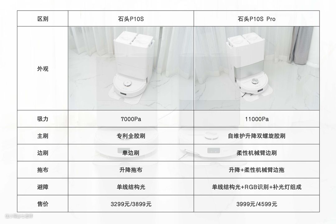 石头P10S与P10S Pro首发起售价格分别是3299元和3999元,石头P10S Pro基站尘盒面板和雷达顶盖为银色金属,机器人吸力超过万帕(11000Pa),升级升降自维护双螺旋胶刷和双机械臂(边刷+边拖),避障系统由单线结构光+RGB识别+补光灯组成。