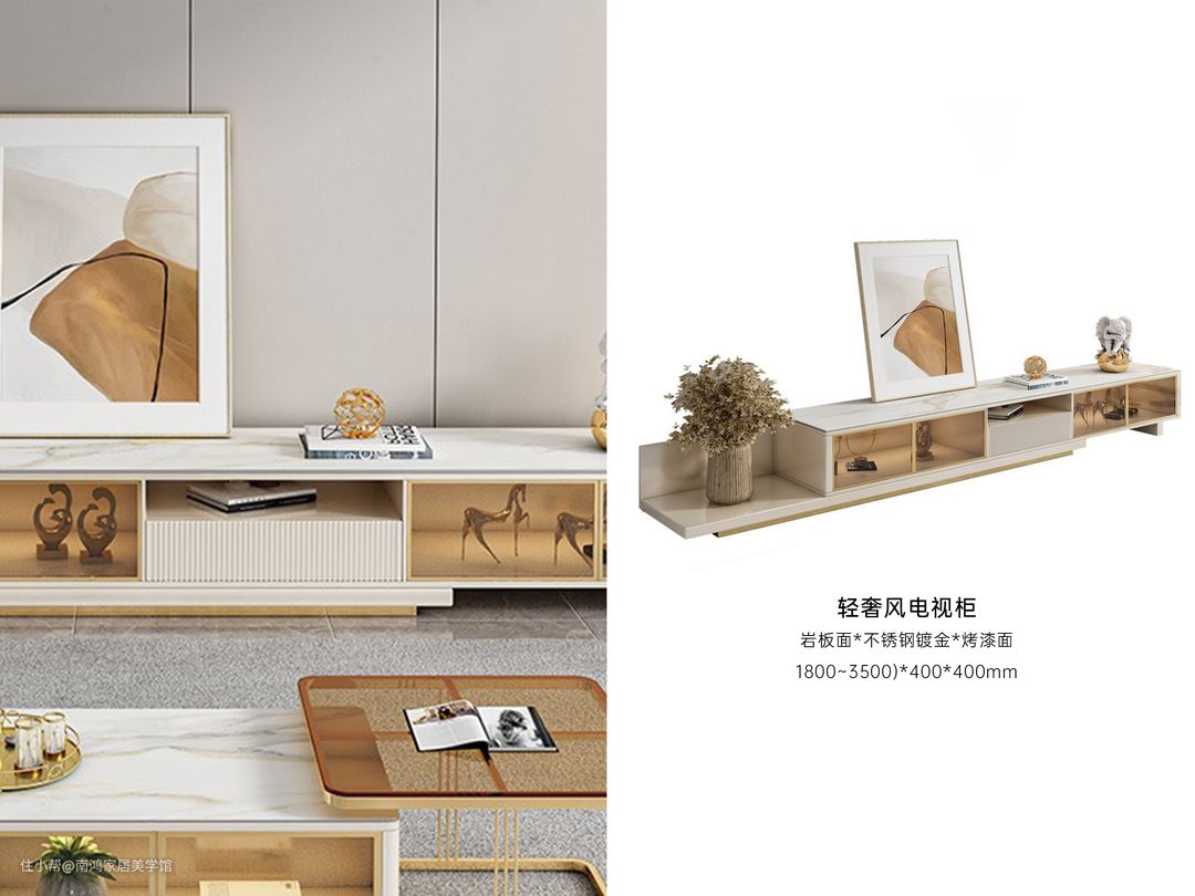 轻奢风电视柜多种材质交织,营造温润通透的双重气质。部分柜面条纹木格栅设计,简洁中透露低奢精巧感;柜体结合封闭和敞开两种状态,居家收纳更灵活高效。电视柜与茶几、餐桌在材质与色调上的重叠,更能渲染干净精致的空间氛围,建议搭配使用~