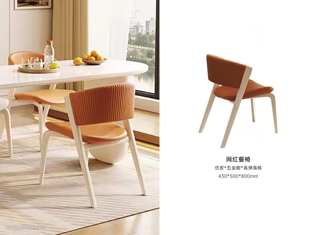 对于配色与材质的精心选用,网红餐椅在极简形态下也透着艺术品的高级独特。利落的造型和温暖的配色,既是餐椅也是家居装饰品。暖橘色和米白色两种颜色的叠加使用,搭配米色餐桌,赋予使用者奢华精致的用餐体验。