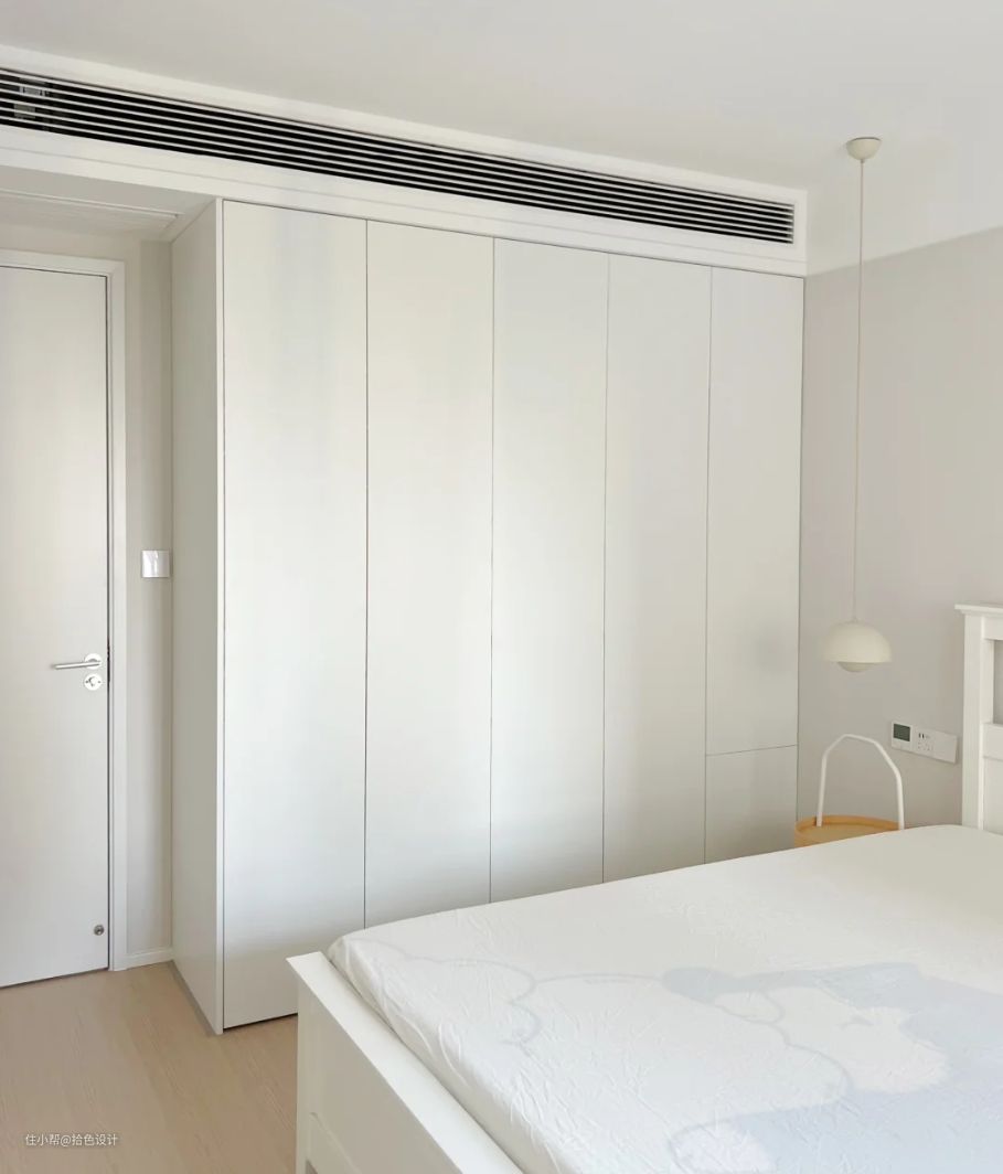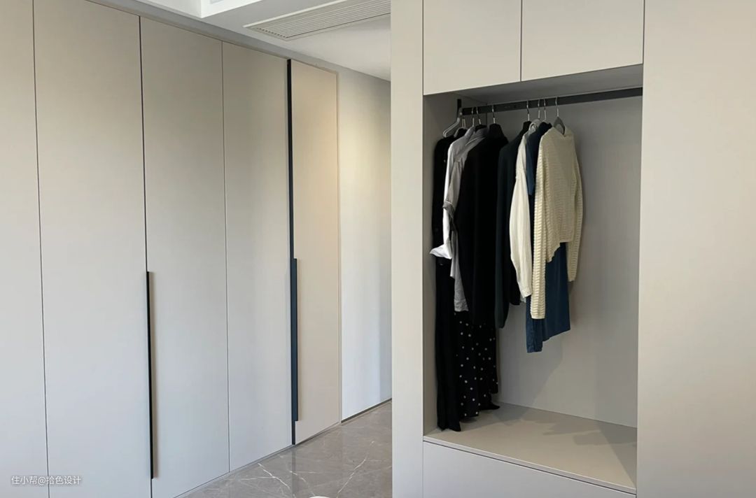 设计方法有很多种,如果大衣柜设计在床头旁边,可以利用衣柜侧面空间设计一块次净衣区;如果大衣柜设计在床尾,可以预留一块开放式空间当作净衣区使用。