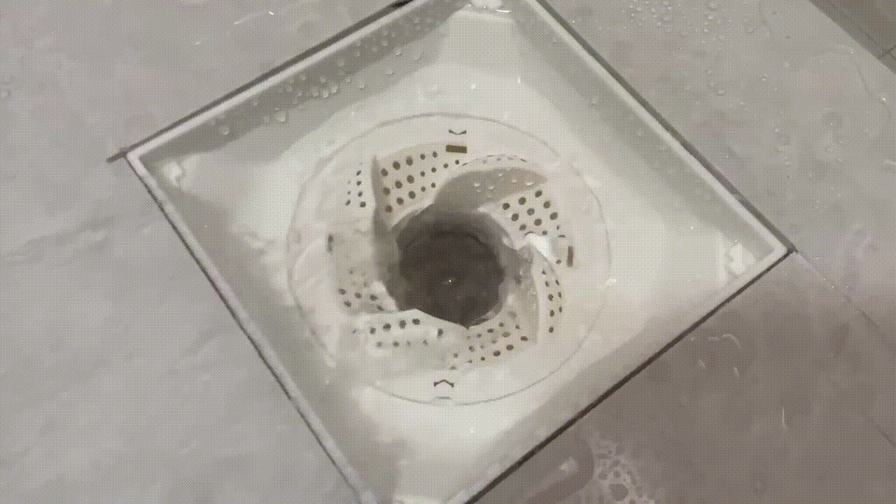 也就是说在日常排水时,会在地漏内部形成一个螺旋水流。这样一来,当毛发流进地漏之后就会自然团成一团,不会卡到过滤片的孔中,所以清理时也方便了许多。