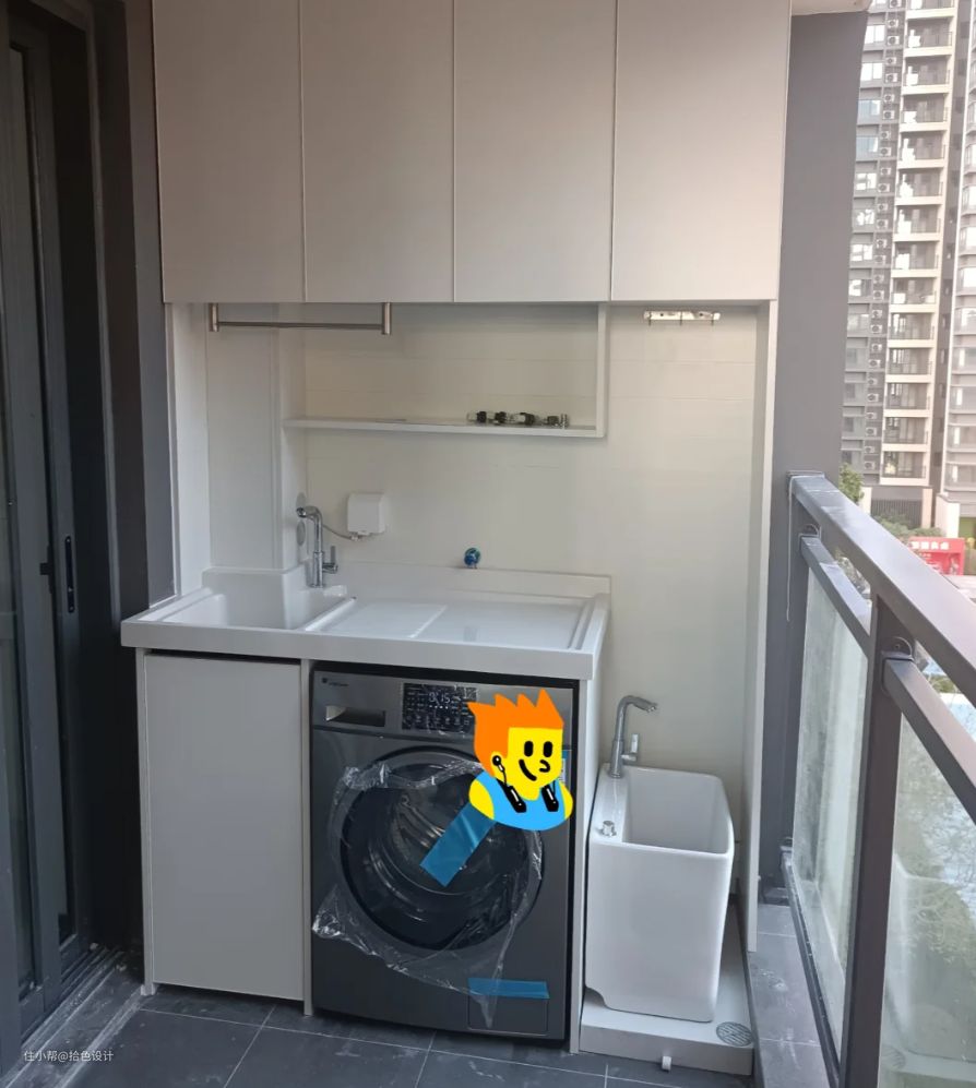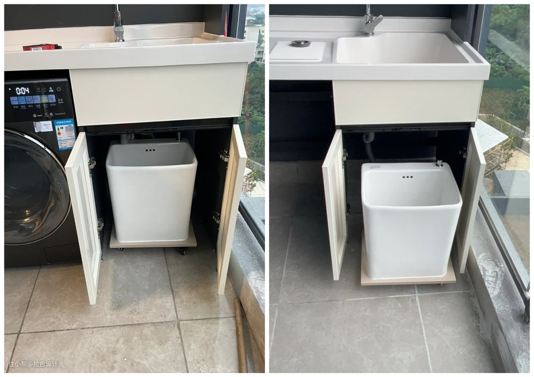 如果空间比较紧凑,那么可以尝试下隐藏设计。比如将其放在阳台洗衣柜里,然后在下面放个移动小拖盘,既省空间又好用。