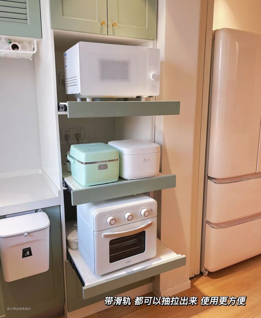 所以,放置小电器的高柜隔层,一定要记得做抽拉设计(安装轨道),这样用起来才会更加方便舒适。