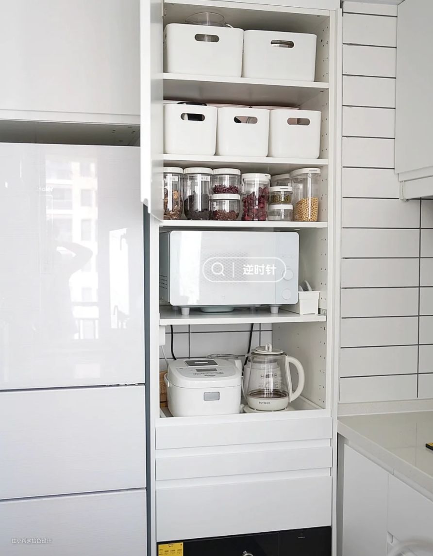 厨房,作为家里的重度收纳区,很多人在定制橱柜时,都喜欢设计一组高柜,用来收纳各种小电器,让空间更加整齐秩序。