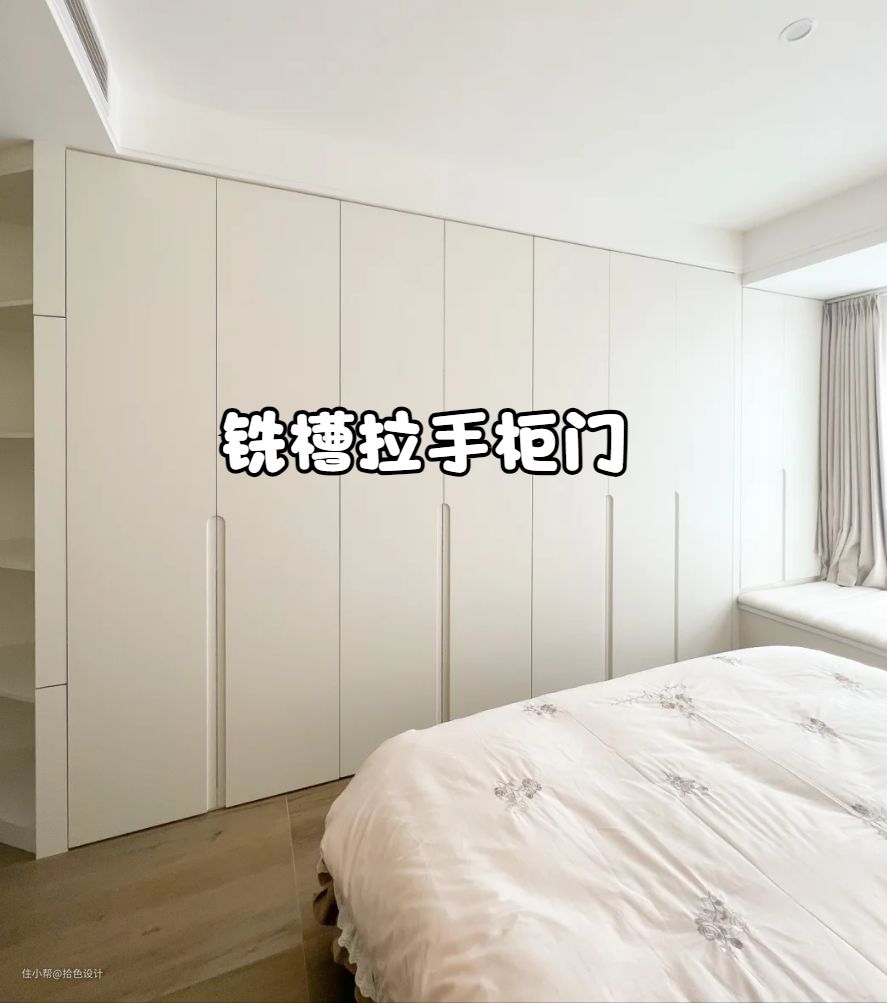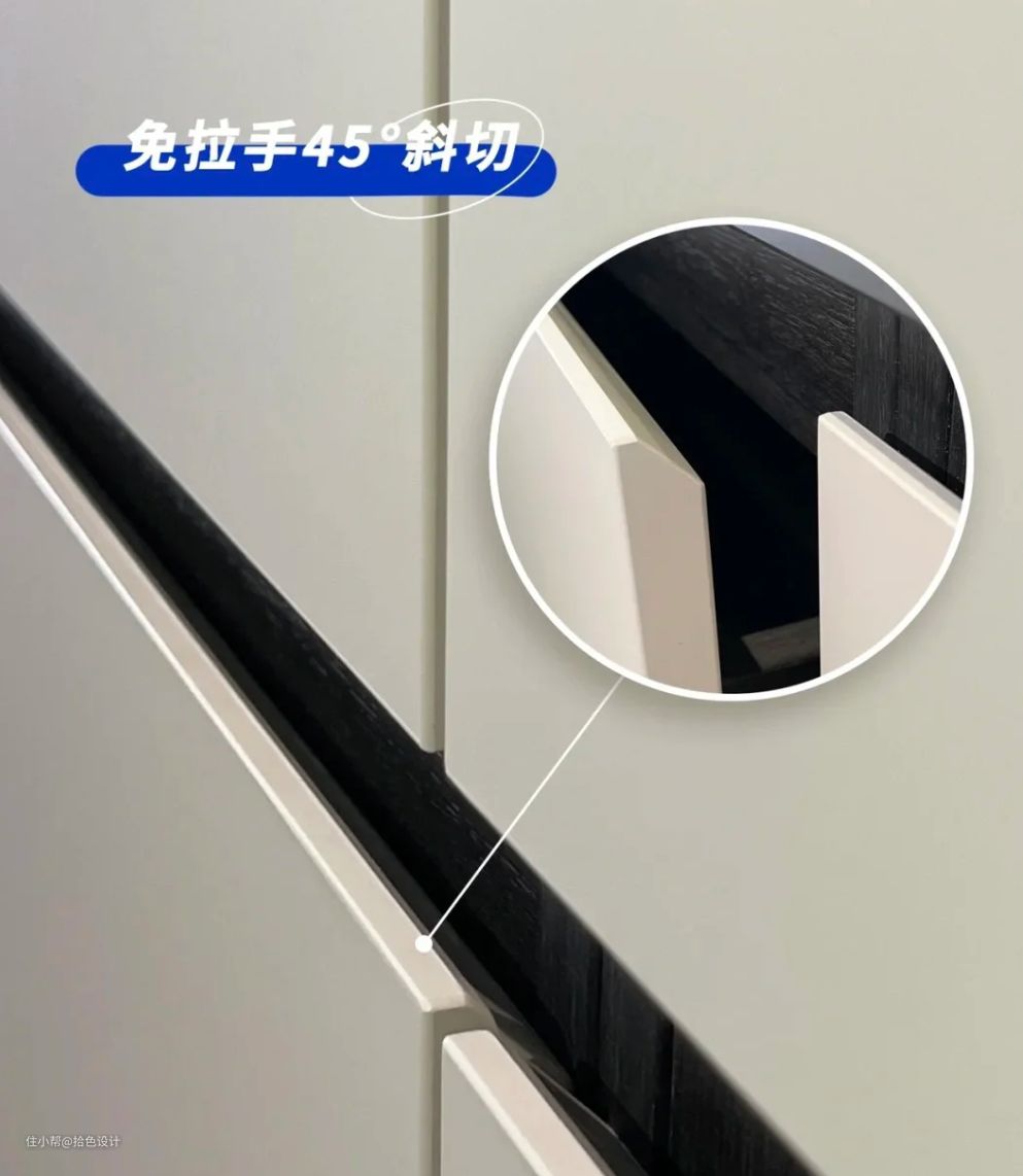 所以,最稳妥的方法,还是给柜门做上拉手设计。分段式柜门,可以做45度斜切拉手;一门到顶的柜门,可以做铣槽拉手,既能达到隐形效果,又非常耐用。
