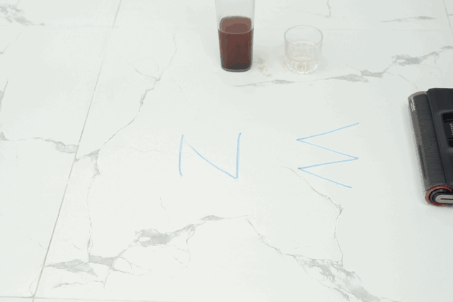 对马克笔痕顽固脏污的清洁并未受机身躺平影响,来回一遍就清洁干净,这得益于完善的水气分离提供几乎无缩减的吸力和刷头处的清水箱持续提供的下压力。
