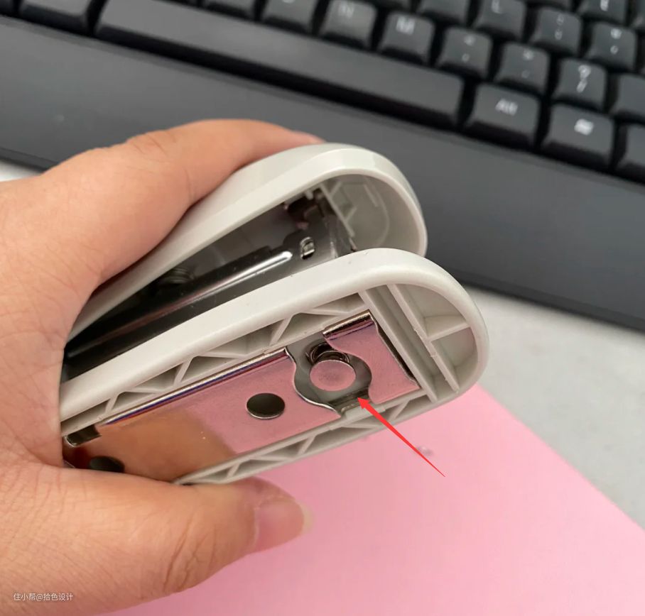 仔细观察的话,可以发现大多数订书机的垫片有两种槽型,并且背面有一个圆型的按钮,只要用力往里一按,垫片就可以上下旋转,切换不同的装订方式。