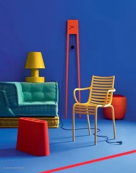 通常来说,鲜亮的色彩组合要让人觉得舒服,降低明度也不失为一个好的方法,色彩降低明度后哪怕使用面积稍微大点也可以,弧线造型和大面积亮色搭配非常的协调。这便又涉及到了其他的的知识,比如色彩与造型、色彩与材质、色彩与图案的配合等等。