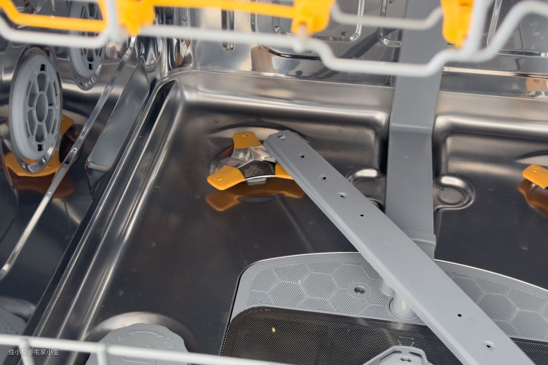 每个品牌洗碗机的喷淋臂细节上有所差别,都是通过喷淋口数量和角度增加水流冲洗范围,不中高端洗碗机具有上中下三条喷淋臂,少数旗舰级机型在底板后侧还增加卫星喷臂,保证水流会更充分的直接冲洗餐具的每个角落,这对于爱吃重口饭菜的北方家庭来说非常实用,浓油赤酱爆炒后的锅具很难清洗,卫星小喷臂的近距离冲洗效果更好。