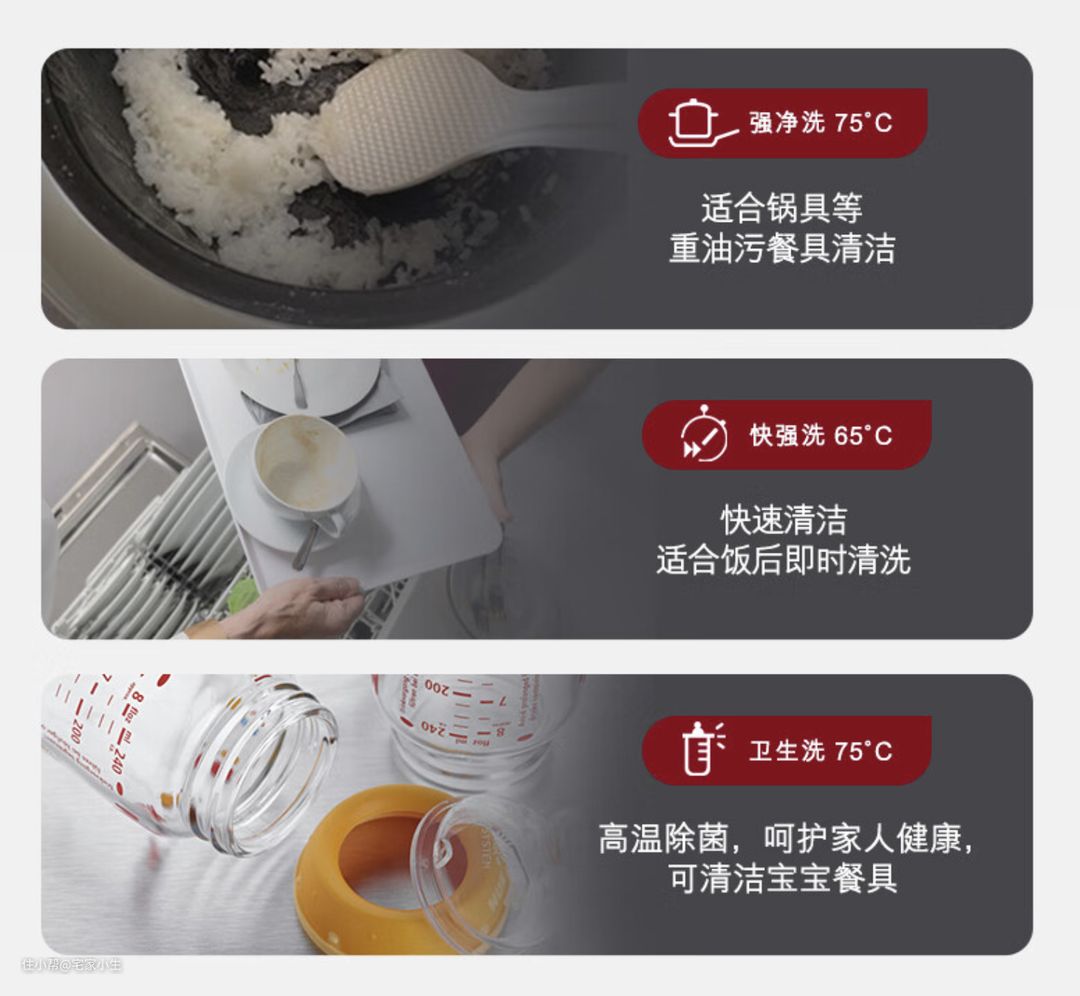 拥有一键开启单消毒功能,高温煮洗、离子净和热烘三重净消程序,升级的“加强洗涤”功能加长了洗涤时长,餐具在清洗过程中健康无菌,干结的顽渍或辅食蛋羹也能清洗。