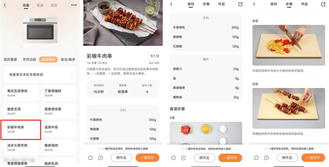 手机上在彩椒牛肉串教程底部点击“一键烹饪”!
