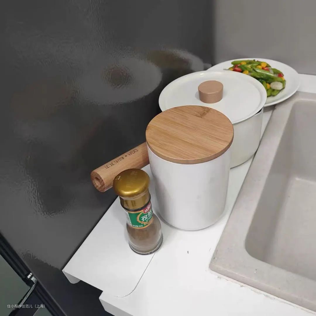 像厨房台面和冰箱之间的缝隙,也用搁板“堵”住,随手放个蔬菜、水果、调味品,不用担心掉下去。