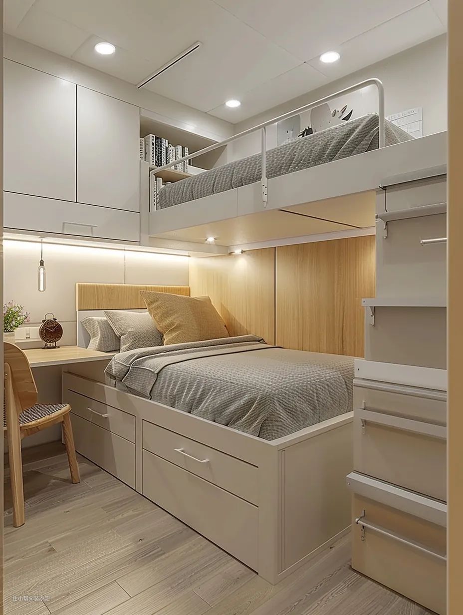 抬高床铺后,床下的空间变得非常宽敞,我们设计了抽屉和储物柜,轻松将季节性的衣物、被褥以及不常用的物品收纳其中。令我惊喜的是,改造后的储物空间竟然是原来的两倍!😲 这样一来,卧室变得整洁有序,再也不用担心东西没地方放了。