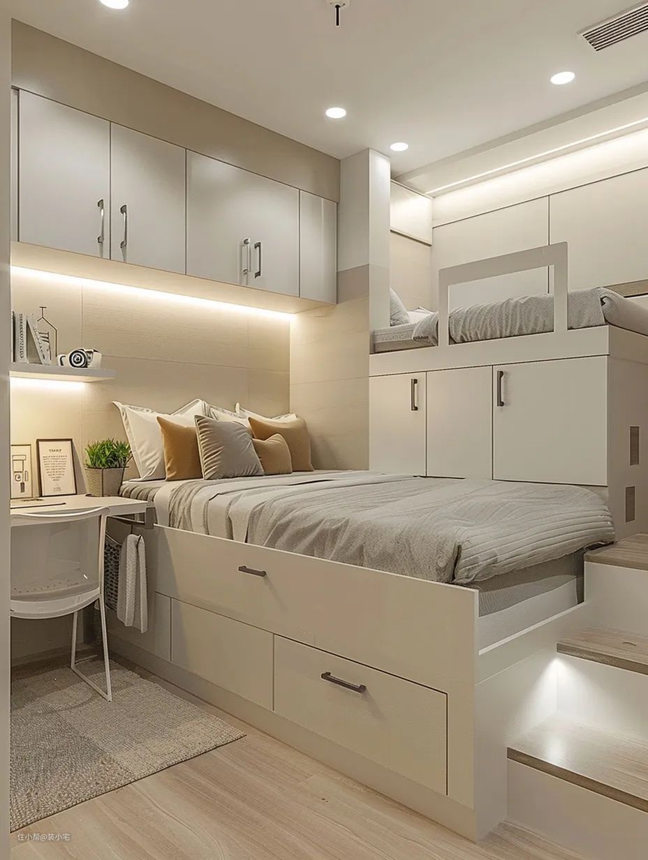 除了增加储物空间外,床下区域还被老公巧妙地设计成了一个小型的功能区。一边是个舒适的阅读角落,安装了温馨的壁灯,晚上躺在床上看书,别有一番情调;另一边则是个小型工作区,摆放了一张简易书桌和椅子,偶尔需要在家加班时,也能有个安静的环境。💻📚