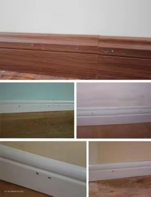 木质踢脚线安装时需要打钉固定,表面会留下钉眼,需要用同色美容胶修补。