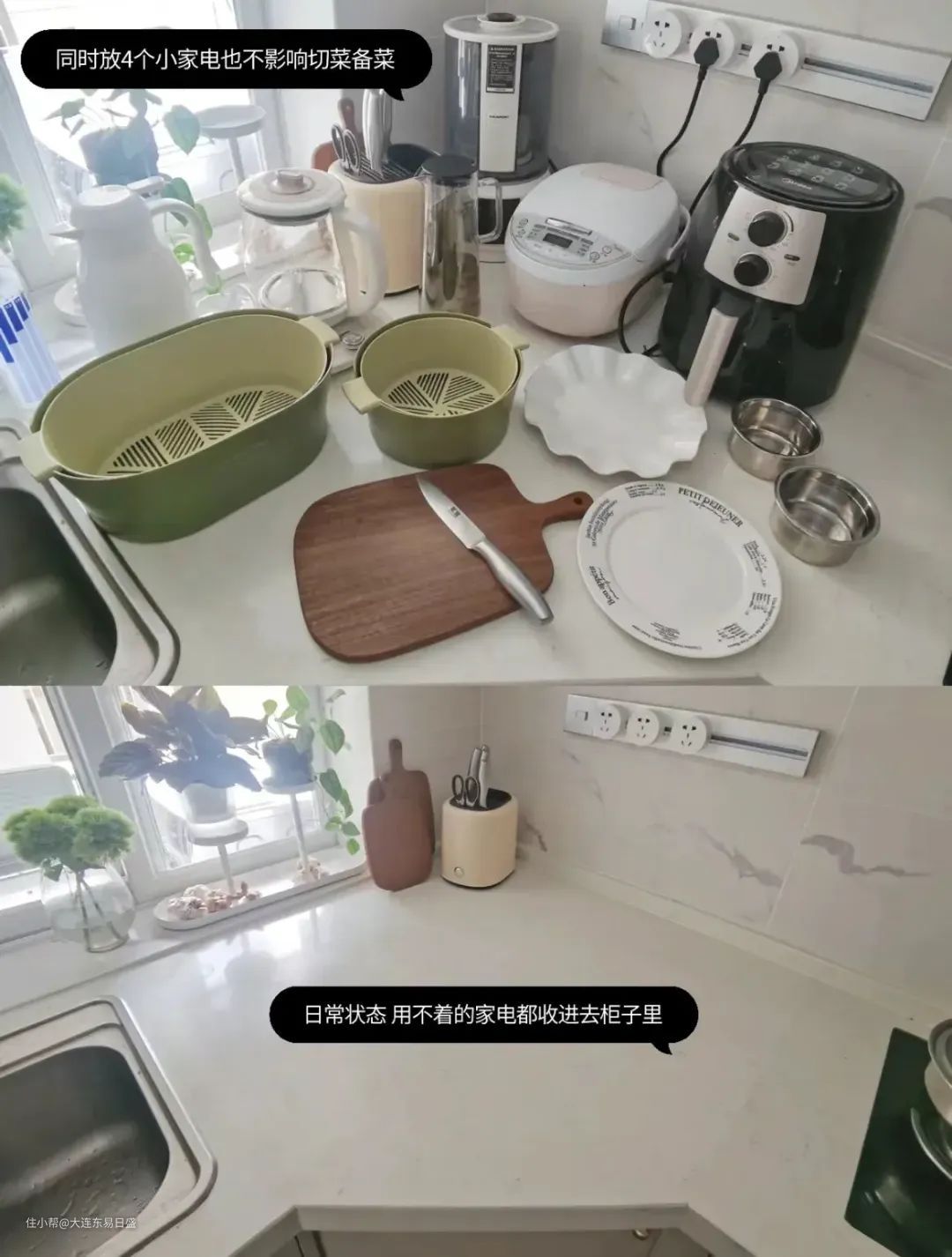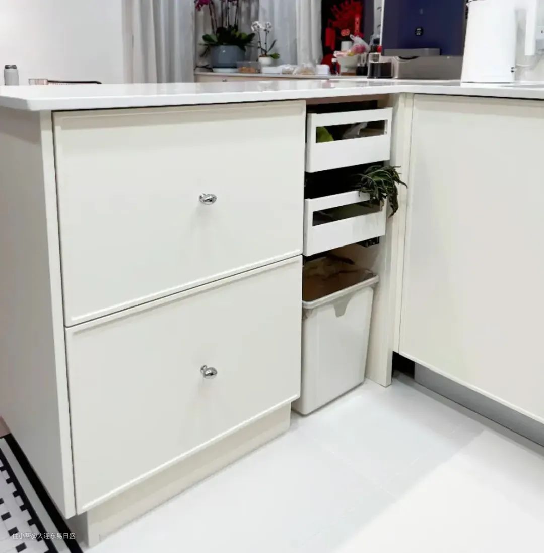 厨房台面下面,橱柜区留一格开放格,可谓是很大胆的设计了,可偏偏就是这个大胆的设计,用过的人都夸好。