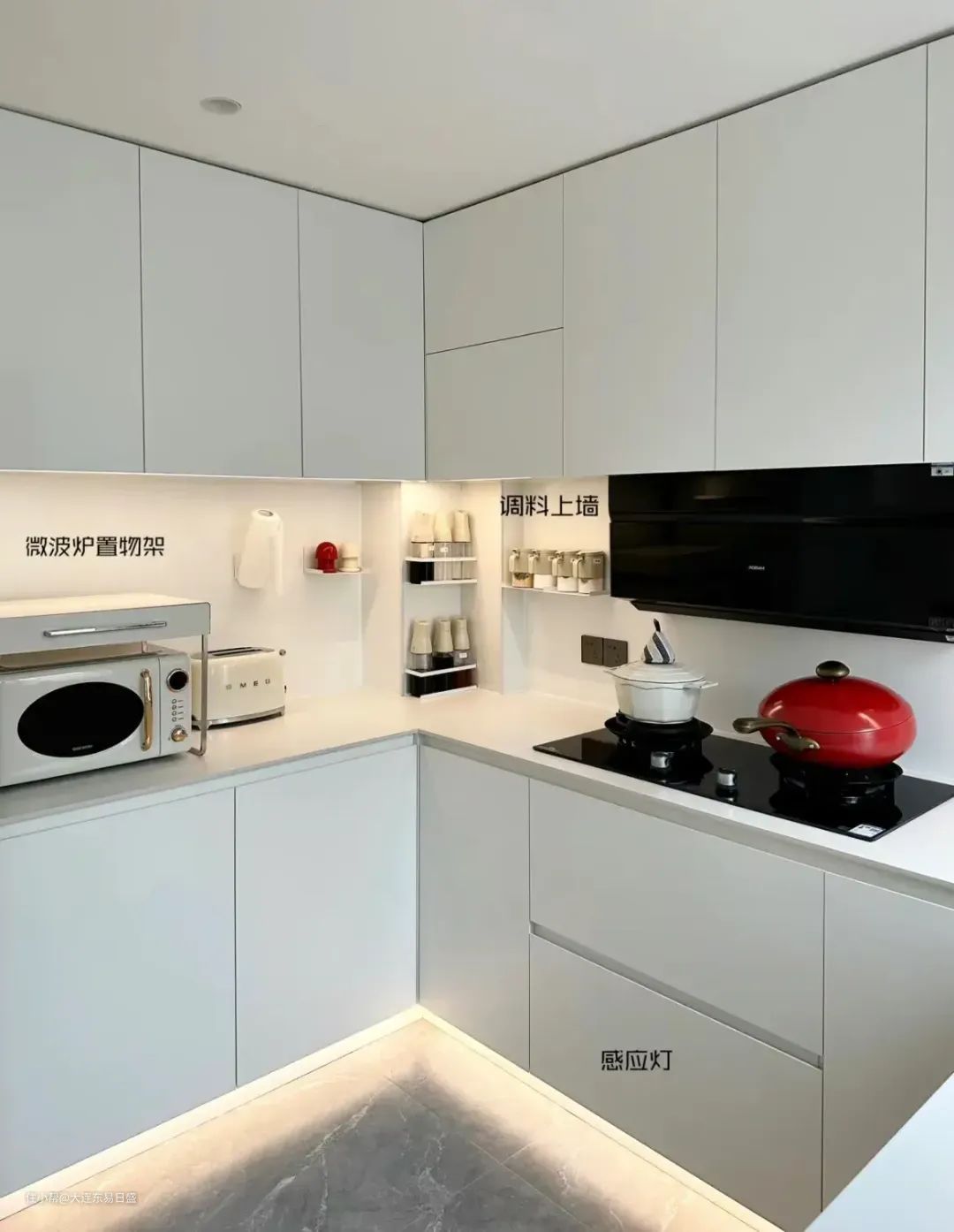 前期未考虑周全的,也不要着急,好在这一点,后期还有弥补方案,在吊柜底下加装补光感应灯条来弥补。