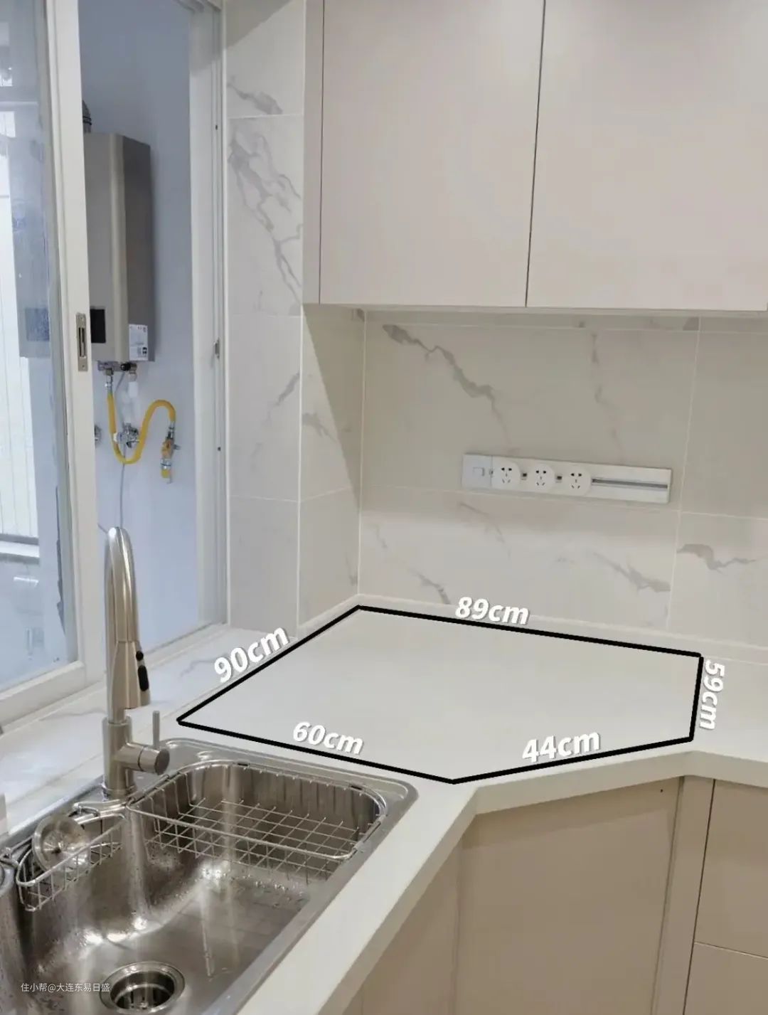 比较好的利用方式是厨房台面转角,从原本的直角,变成钻石型。