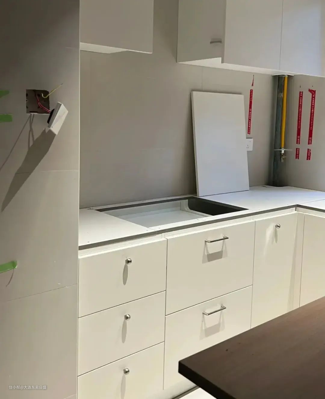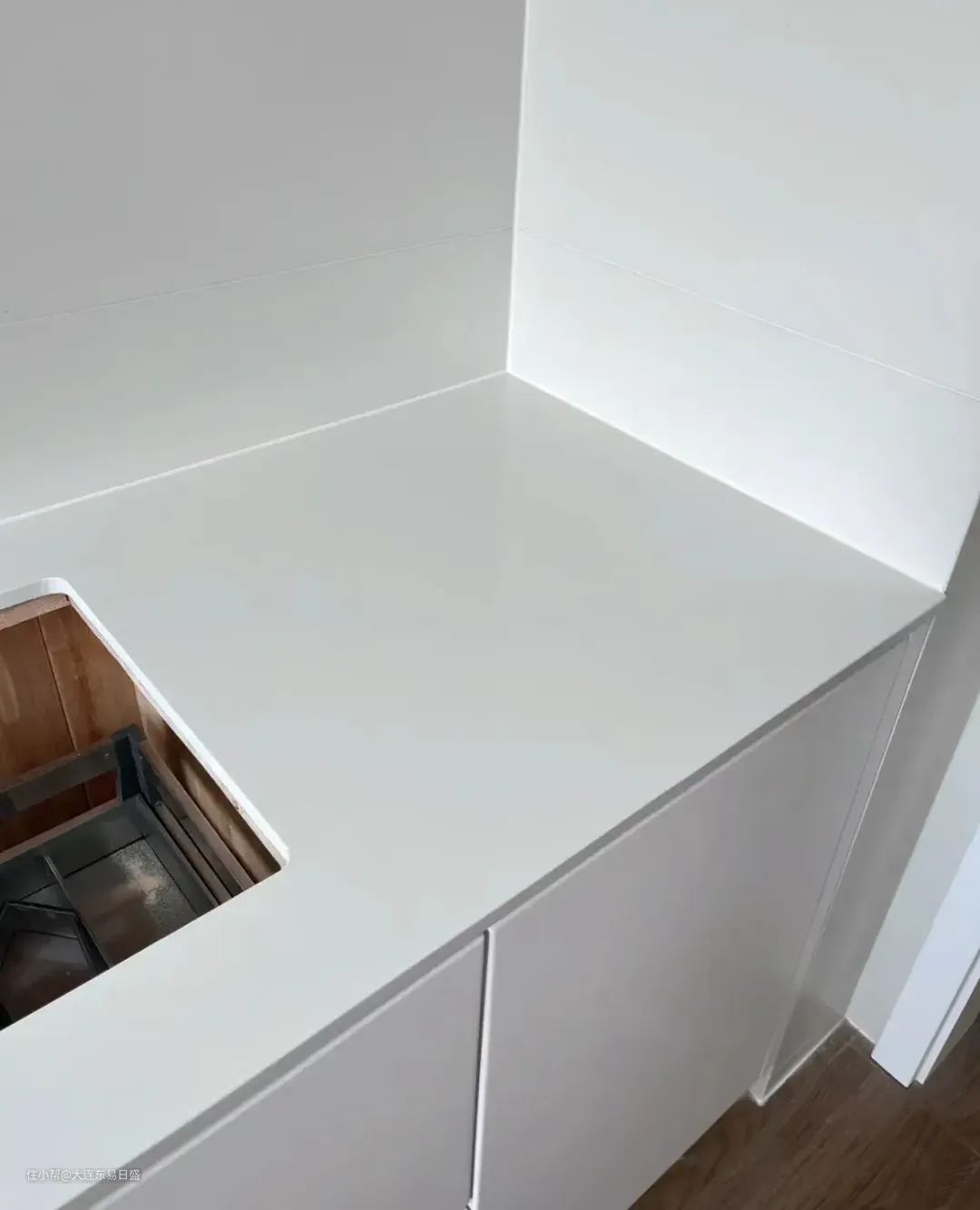 但是需要注意的是,无挡水条对墙面的垂平度要求比较高,台面与墙面才能绝对的贴合,如果有此想法,瓦工阶段就要格外留意。