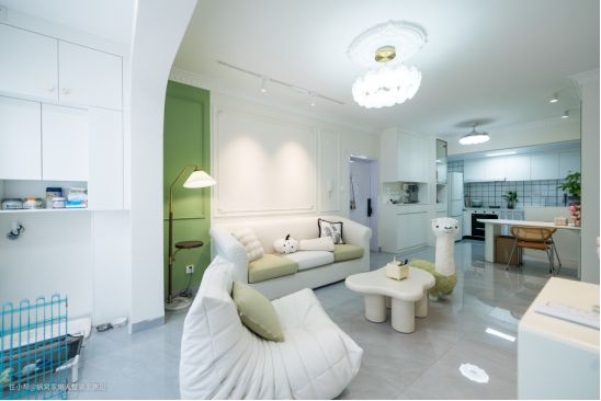 方正、直条形的家具给人严肃、利落的感觉,与奶油风追求的柔和相悖;同理,在材质上也应避开皮质、金属类的家具,选择绒布、羊羔绒这类自带温暖感的。