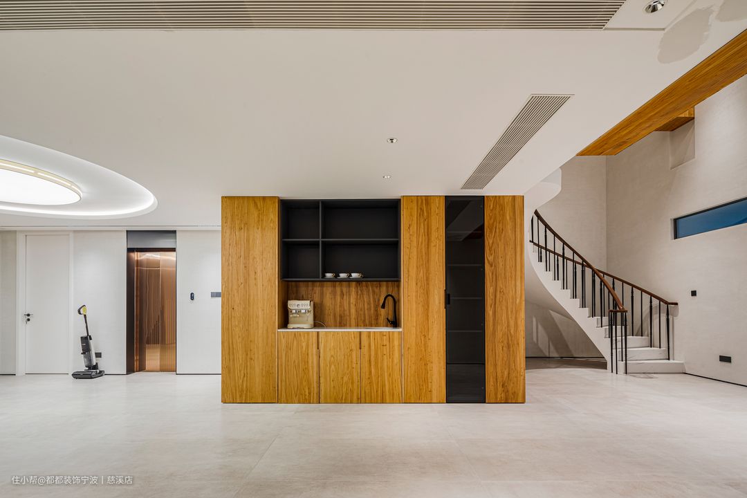 为了应对逢年过节的亲友聚餐,专门在负一楼设置宴会厅,圆形吊顶+圆形吸顶灯,宴会厅的轻奢氛围直接拉满。空间一侧设置原木色隐形收纳柜,餐具与用餐杂物轻松收纳其中。另一侧设置水吧台,佐餐饮品需求在这里得到满足。