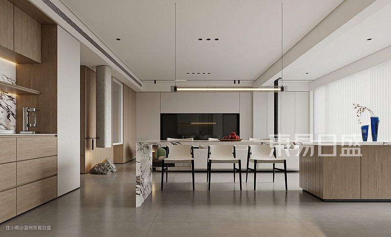 餐厅空间宽阔,在6人位餐桌至上,改增色了岛台设计,兼顾西厨操作台功能,同时作为厨房功能的延伸,也增强了餐厨之间的互动性。