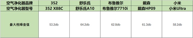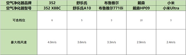 从测试结果明显看得出来,除了戴森PH09和小米Ultra之外,其他几款空气净化器的风速都在3m/s以上。其中352 空气净化器X88C的风速最大,达到了4.0m/s。小米Ultra的风速最小,只有2.0m/s。