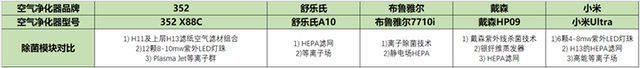 从数量来看,出352空气净化器 X88C的层数是最多的。布鲁雅尔7710i、小米Ultra并列第二,舒乐氏A10是有五层,戴森HP09是也两层。