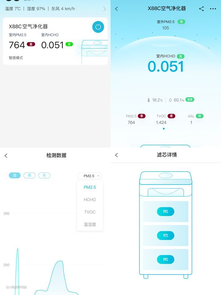 352 X88C可以绑定官方app进行远程操控,对于我这种智能家居爱好者来说,无疑是非常喜欢的。在上面能看到多项空气质量相关数值,远程进行机器开关操作,还可以查看滤芯使用进度,尤其是冬天不愿意下床的时候,这项功能就更“香”了。
