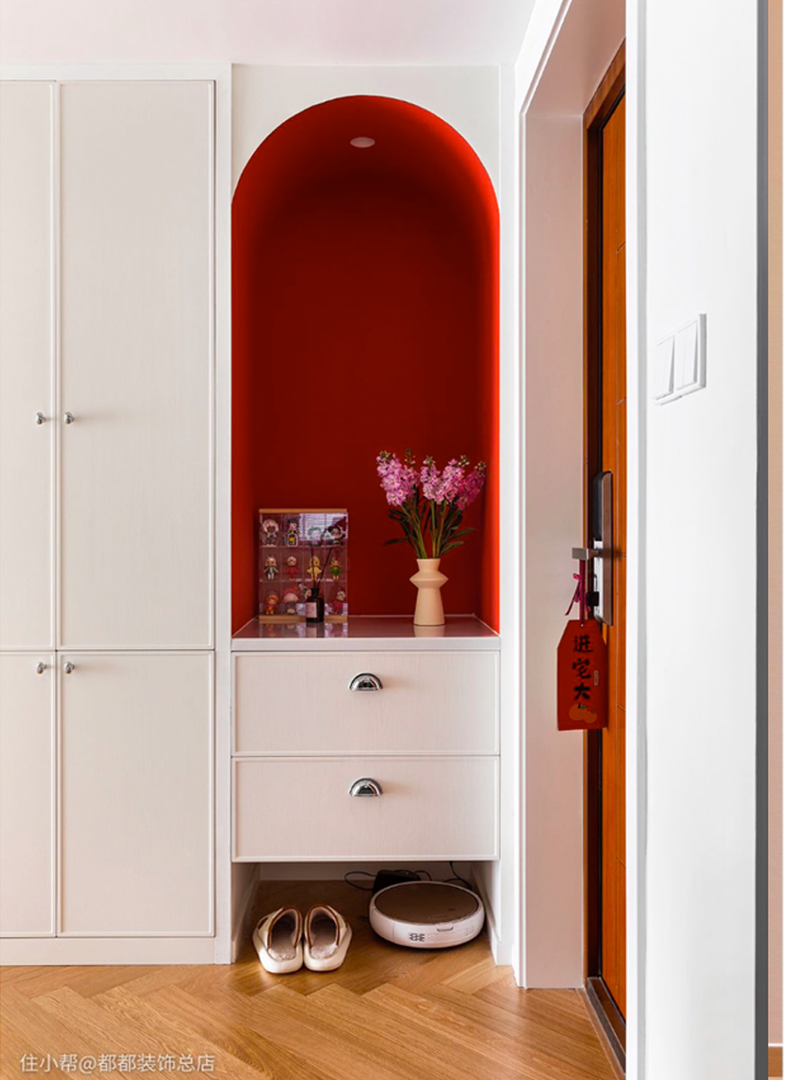 特别注意:由于宽度受限,建议只放换鞋凳、小巧的置物台,鞋子的收纳放在其他空间,比如和餐边柜结合。
