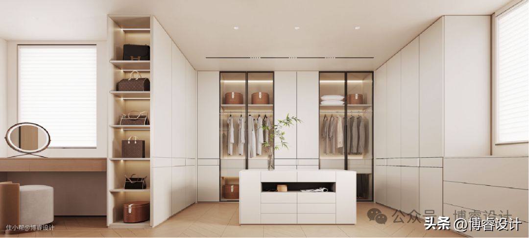 衣帽间是玻璃+木材混搭,叠放、挂衣区合理分区,满足不同的穿搭需求。梳妆一体的设计,一举多得。